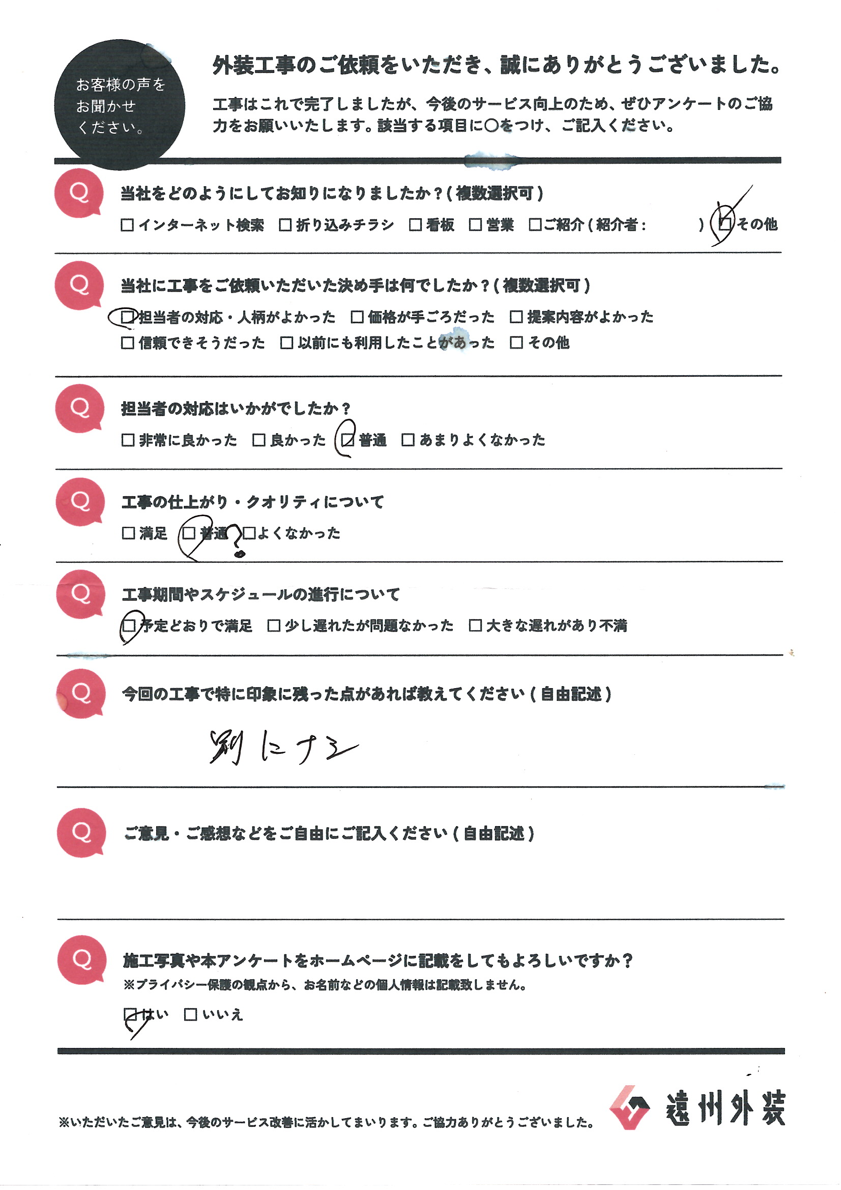 ここでは、これまでに施工を担当させていただいたお客様の率直なご意見をそのままご紹介しています。遠州外装にご依頼を検討されている方にとって、少しでも参考になれば幸いです。